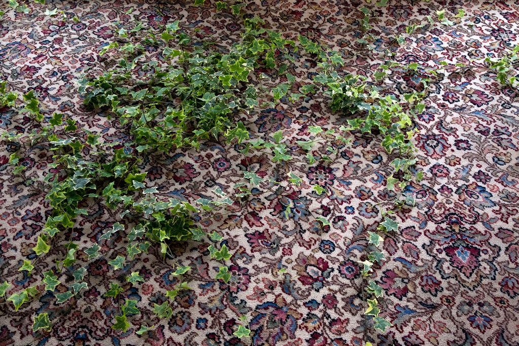 From the front door to the upstairs bedroom and back to the basement, the installation comprising invasive plants species and hedges governed the audience’s movements, rendering them at times as guests and at times trespassers. At one instance, visitors encountered an oscillating water sprinkler, keeping them at bay with its sprays of water; in another, the original floral carpet from the house created the illusion of sprouting with natural ivy. These territorial gardens addressed the naturalisation of barriers, where every garden is a guarded space, an enclosure, a compound. Water, vegetation and gardening tools created discriminatory spaces, keeping some species alive and others dead.